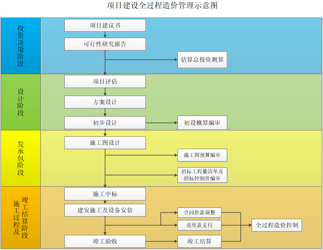 實(shí)踐中,建設(shè)工程全過(guò)程造價(jià)管理可以概括為貫穿于項(xiàng)目建設(shè)過(guò)程中的4個(gè)階段,分別為項(xiàng)目的決策階段、設(shè)計(jì)階段、發(fā)承包階段、施工過(guò)程以及竣工結(jié)算階段。