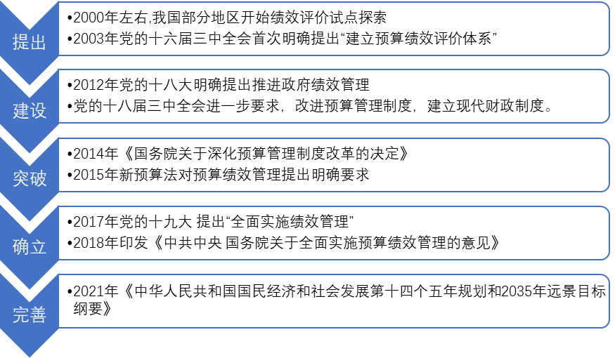自2000年,我國(guó)部分地區(qū)就開始了績(jī)效評(píng)價(jià)試點(diǎn)探索,經(jīng)過二十余年不斷發(fā)展和完善,確立了全面實(shí)施預(yù)算績(jī)效管理改革的主要方向和目標(biāo)。
