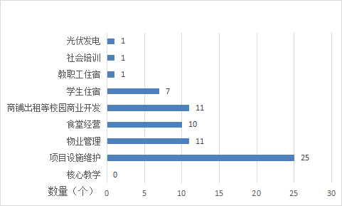 按照項(xiàng)目公司運(yùn)營(yíng)內(nèi)容是否包含教學(xué)內(nèi)容等核心業(yè)務(wù),公立高等學(xué)校PPP項(xiàng)目可以分為兩類。實(shí)踐中,由于高校教學(xué)任務(wù)的特殊性、專業(yè)性以及教育領(lǐng)域企業(yè)傾向于輕資產(chǎn)運(yùn)營(yíng)等原因,較多公立高等學(xué)校PPP項(xiàng)目核心教學(xué)任務(wù)由學(xué)校開展,非核心教學(xué)內(nèi)容交由項(xiàng)目公司負(fù)責(zé)。全國(guó)PPP綜合信息平臺(tái)管理庫(kù)顯示共有25個(gè)高等學(xué)校PPP項(xiàng)目進(jìn)入執(zhí)行階段并滿6個(gè)月(此時(shí)可對(duì)外公示項(xiàng)目實(shí)施方案等信息),其項(xiàng)目運(yùn)營(yíng)維護(hù)內(nèi)容集中于項(xiàng)目設(shè)施維護(hù)、物業(yè)管理、食堂經(jīng)營(yíng)、學(xué)生住宿和商鋪出租等商業(yè)開發(fā)。