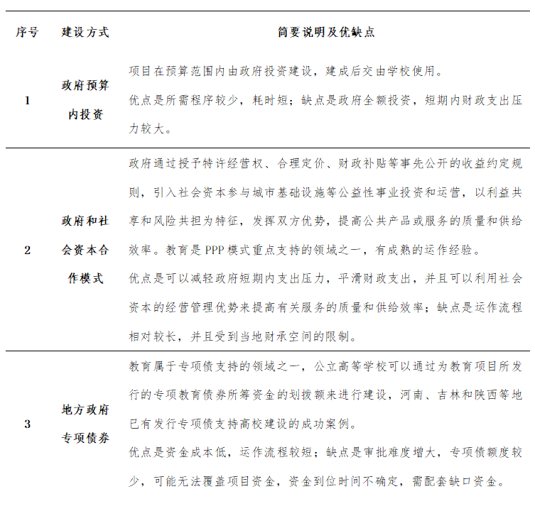 根據(jù)《政府投資條例》、《防范和化解地方政府隱性債務(wù)風(fēng)險(xiǎn)的意見》(中發(fā)〔2018〕27號(hào))等法規(guī)政策精神,目前公立高等學(xué)校主要有以下幾種建設(shè)方式: