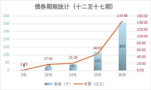 本次發(fā)行項(xiàng)目十二至十七期中債券期限包含5年、10年、15年、20年、30年。其中30年長(zhǎng)期限項(xiàng)目合計(jì)310個(gè),占全部發(fā)行項(xiàng)目的61.39%,30年長(zhǎng)期限項(xiàng)目也是發(fā)行金額最多的,總?cè)堪l(fā)行金額的61.86%。