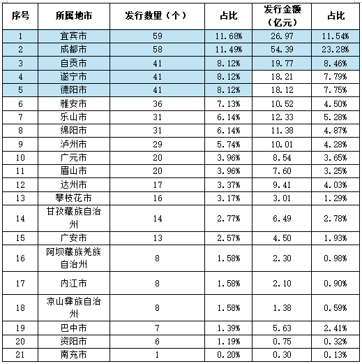 本次專項(xiàng)債券發(fā)行十二至十七期中,四川省18個(gè)地級(jí)市和3個(gè)自治州均有項(xiàng)目。其中發(fā)行項(xiàng)目數(shù)量前五的分別為宜賓市59個(gè)、成都市58個(gè)、德陽(yáng)市41個(gè)、遂寧市41個(gè)、自貢市41個(gè);發(fā)行金額前三的分別為成都市54.3930億元、宜賓市26.9712億元、自貢市19.7727億元。具體分布如下表: