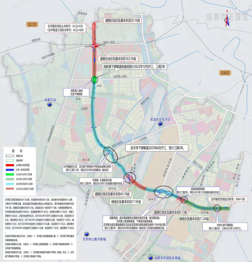 五環(huán)路位于成都市繞城高速、第二繞城高速之間,串聯(lián)龍泉驛區(qū)、天府新區(qū)、雙流區(qū)、溫江區(qū)、高新西區(qū)、郫都區(qū)、新都區(qū)、青白江8個區(qū)。五環(huán)路雙流段全長約27.335公里,全線建設(shè)采用一級公路兼城市配套標(biāo)準(zhǔn),北至溫江界,南至劍南大道,建設(shè)內(nèi)容具體包括道路工程、橋涵工程、隧道工程、交叉工程、環(huán)保綠化、交安、機電、市政配套工程、景觀綠化等,主線設(shè)計速度 80Km/h。本項目估算總投資約92.82億元。